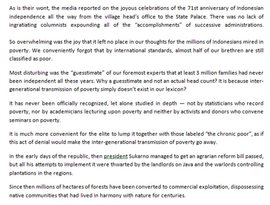 As is their wont, the media reported on the joyous celebrations of the 71st anniversary of Indonesian independence all the way from the village head’s office to the State Palace. T...