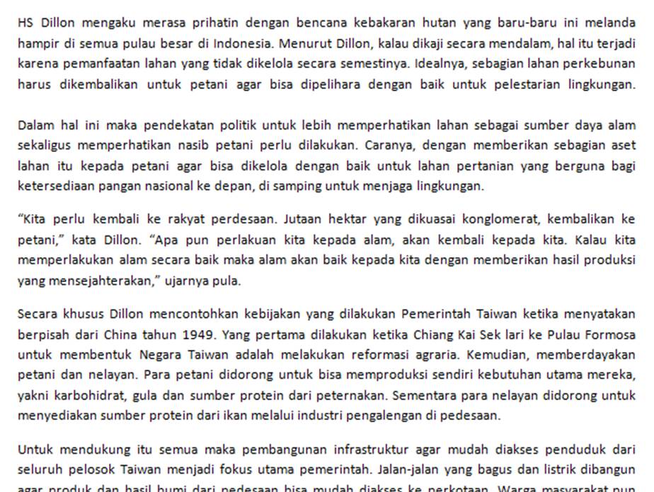 HS Dillon mengaku merasa prihatin dengan bencana kebakaran hutan yang baru-baru ini melanda hampir di semua pulau besar di Indonesia. Menurut Dillon, kalau dikaji secara mendalam, hal itu terjadi karena pemanfaatan lahan yang tidak dikelola secara semestinya. Idealnya, sebagian lahan perkebunan harus dikembalikan untuk petani agar bisa dipelihara d...