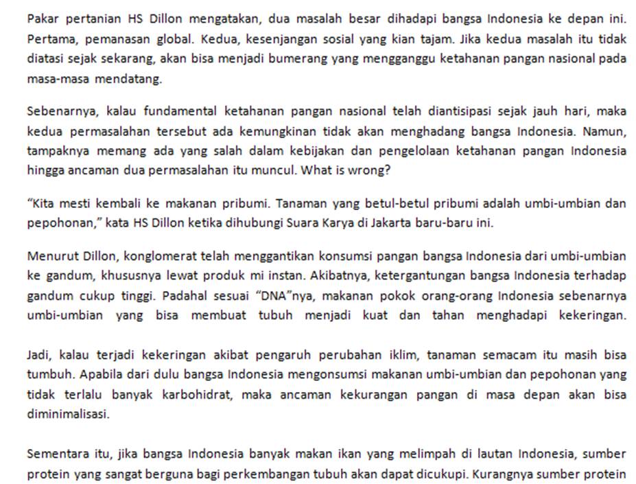 Pakar pertanian HS Dillon mengatakan, dua masalah besar dihadapi bangsa Indonesia ke depan ini. Pertama, pemanasan global. Kedua, kesenjangan sosial yang kian tajam. Jika kedua masalah itu tidak diatasi sejak sekarang, akan bisa menjadi bumerang yang mengganggu ketahanan pangan nasional pada masa-masa mendatang.